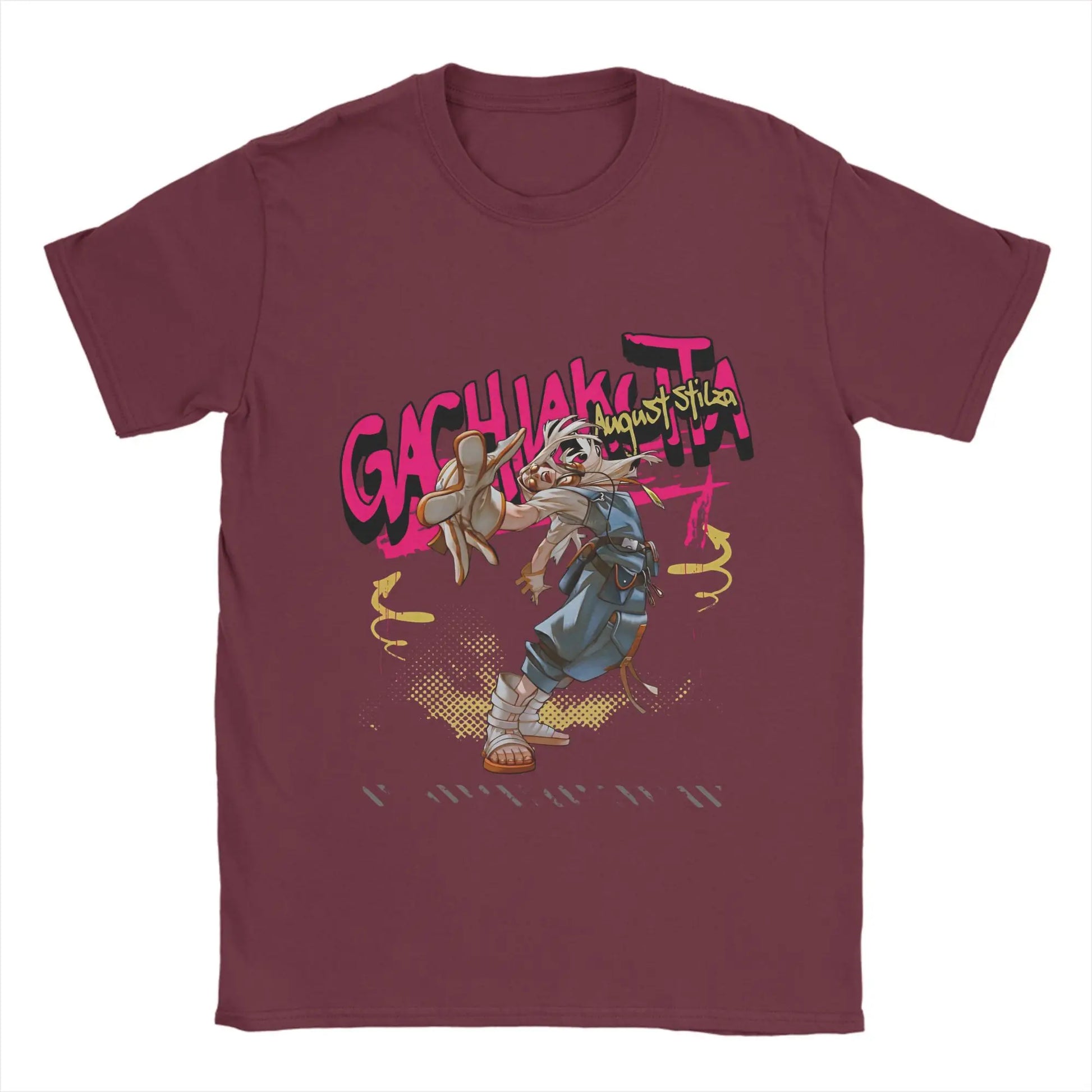 The rich burgundy backdrop enhances the dynamic artwork, making Zanka’s character and the Gachiakuta graffiti-style logo stand out in stunning contrast. Combined with the “August Style” text, this T-shirt captures the rebellious and artistic essence of the series.