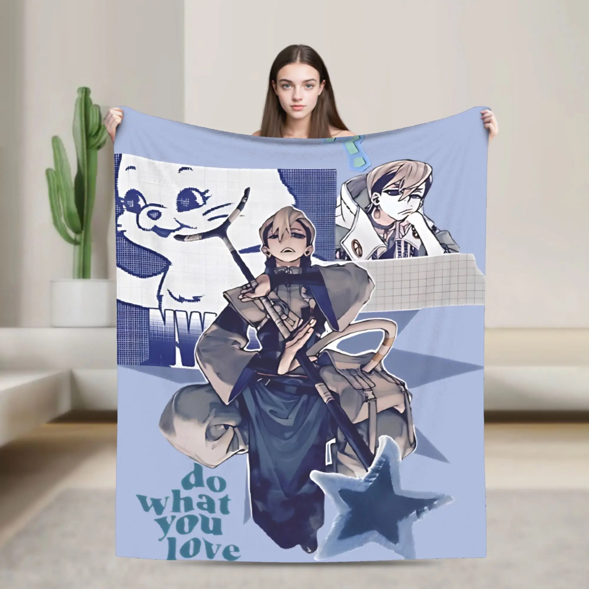 The Blue Edition design merges Japanese manga influences with contemporary graphic art. Its pastel blue tones and collage layout give it a unique, artistic flair while keeping the focus on Zanka’s graceful character. Whether used as a blanket or displayed as wall art, it adds a sophisticated anime touch to your home.